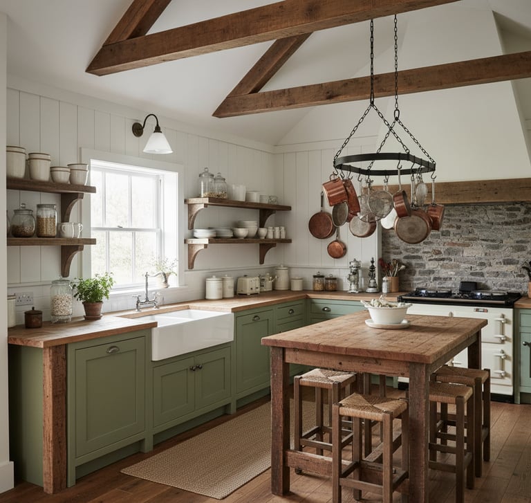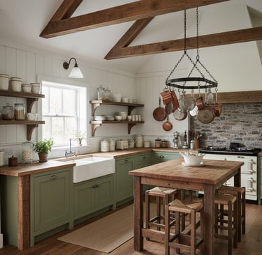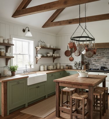 The rustic farmhouse kitchen brings a sense of warmth and coziness, making it an ideal gathering spot. To achieve this look, incorporate natural materials like wooden beams, reclaimed wood, and stone. Elements like a large apron-front sink (farmhouse sink), open shelving displaying earthy dishware, and vintage-style appliances all contribute to an inviting and comfortable atmosphere.