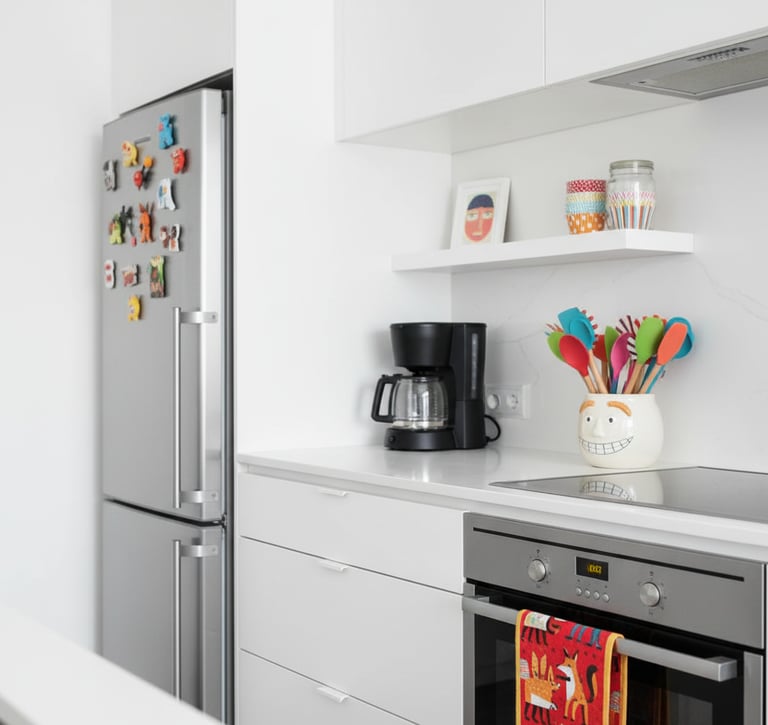 Even the most high-tech or minimalist kitchen can benefit from a touch of fun. Playful accessories are an easy, low-commitment way to bring joy and personality to your space. This can be as simple as vibrant dish towels with quirky prints, whimsical cupcake liners, a colorful utensil holder, or a fun magnet set on the refrigerator.