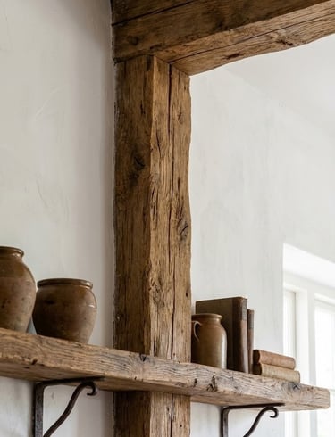 Exposed wooden beams, reclaimed wood shelving, or even a simple branch used as a curtain rod can reinforce the "cabin in the woods" feel. The raw grain and warmth of wood provide a necessary weight to the otherwise light and airy aesthetic.