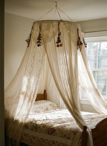 Nothing says "storybook retreat" quite like a canopy. You don't need a massive four-poster bed to achieve this; simply hanging sheer linen or lace fabric from the ceiling can create a protective, fairytale-like cocoon around your sleeping area.
