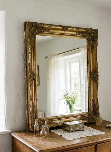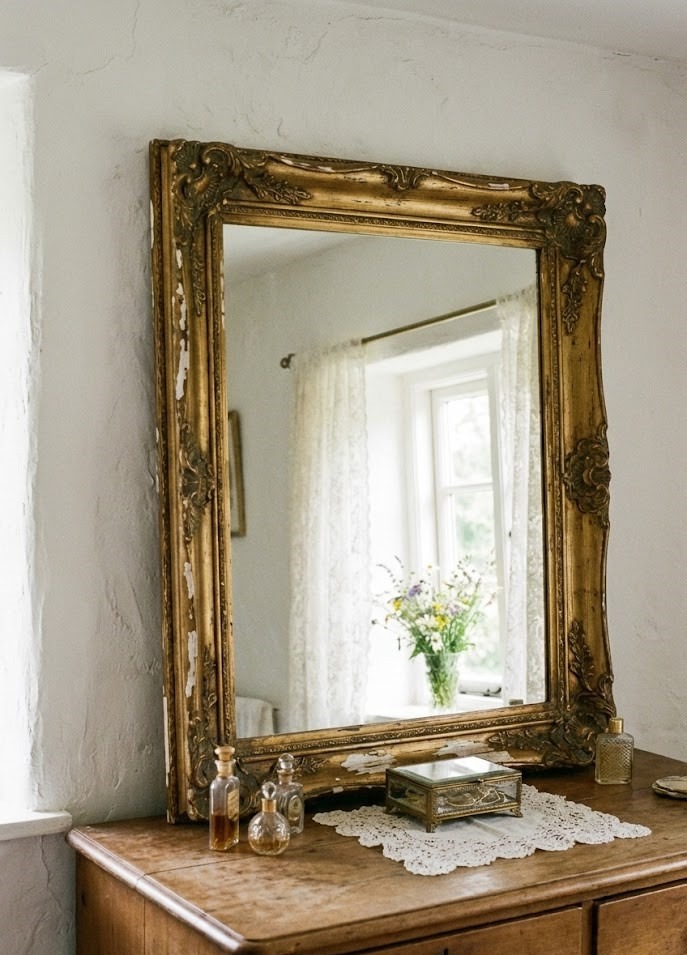 An antique mirror with an ornate gold or wood frame acts as a window into another era. Beyond its practical use, a vintage mirror reflects natural light and adds a touch of "shabby chic" elegance to a dresser or an empty wall.