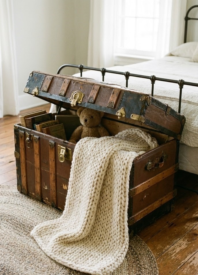Instead of modern plastic bins, use antique trunks at the foot of the bed or wicker baskets for your linens. For a more "airy" feel, consider open shelving with decorative brackets, which allows you to display your favorite books and trinkets as part of the decor.