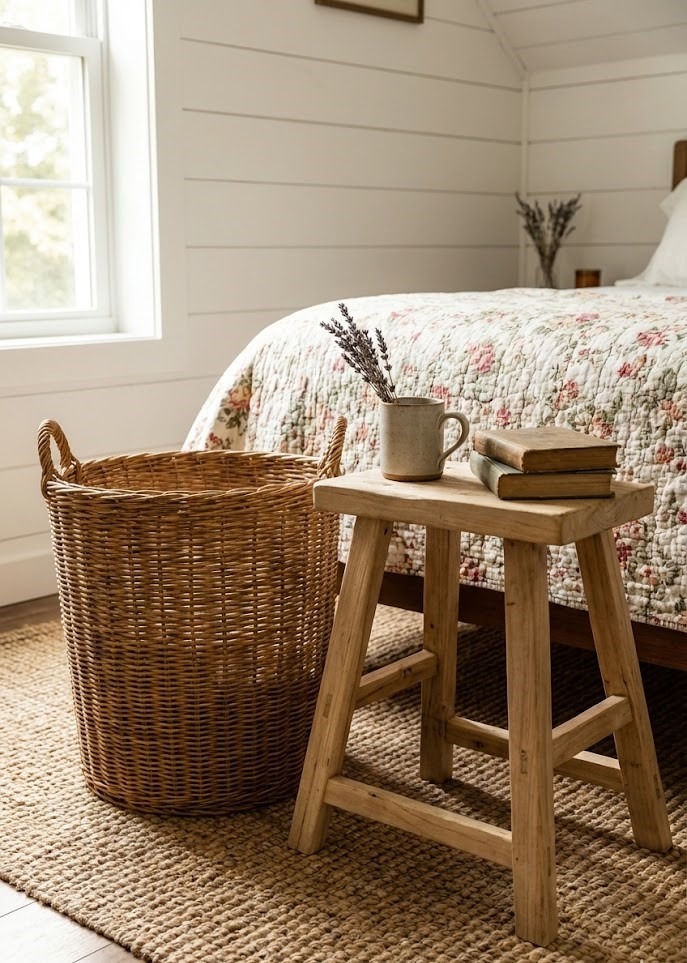 To keep the room grounded, use materials like wicker, rattan, jute, and raw wood. A wicker laundry basket or a simple wooden stool used as a nightstand brings an organic, rustic texture to the space that balances out the softness of the floral fabrics.