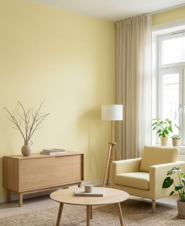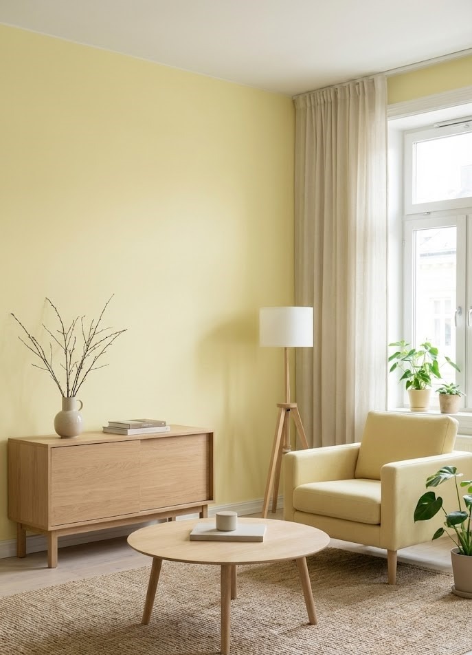 For a clean, minimalist look, pair pale lemon yellow with light woods like oak or ash. This combination is staples of Scandinavian design—it’s bright, functional, and deeply calming.