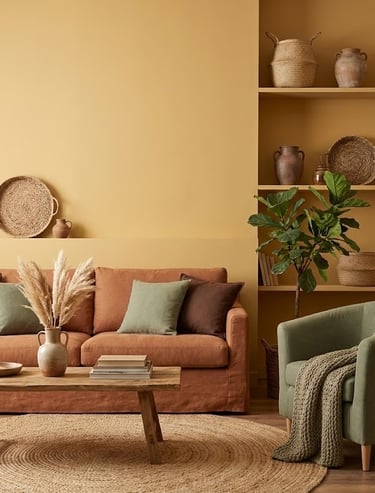 For a room that feels "grounded," pair honey-toned yellows with earth tones like terracotta, sage green, and chocolate brown.