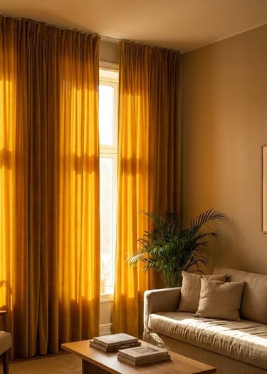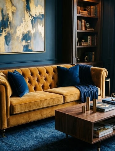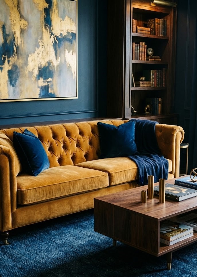 A velvet sofa in a golden or ochre shade is the ultimate "wow" piece. Velvet adds a tactile richness that makes the color shift and glow depending on the light.