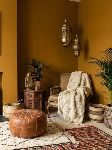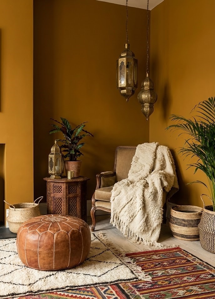 Ochre is a deeper, more orange-toned yellow that works beautifully with Moroccan-inspired decor. Think brass lanterns, textured rugs, and leather poufs.