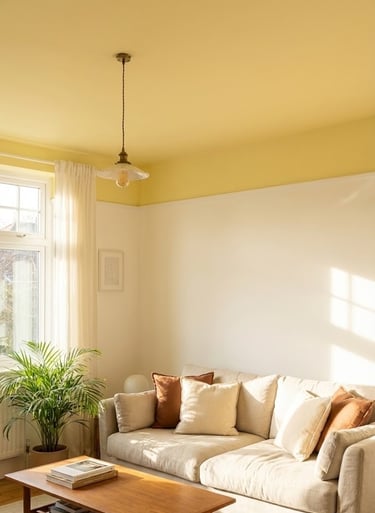 Painting the "fifth wall" (the ceiling) a soft, pale yellow is a designer secret for creating perpetual "golden hour." It draws the eye upward and makes the room feel cozy and sun-kissed.