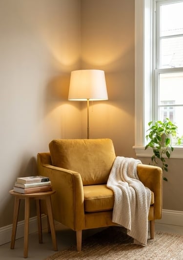 A single yellow armchair can define an entire corner. It’s the perfect way to add personality to a neutral room without committing to a full furniture set.