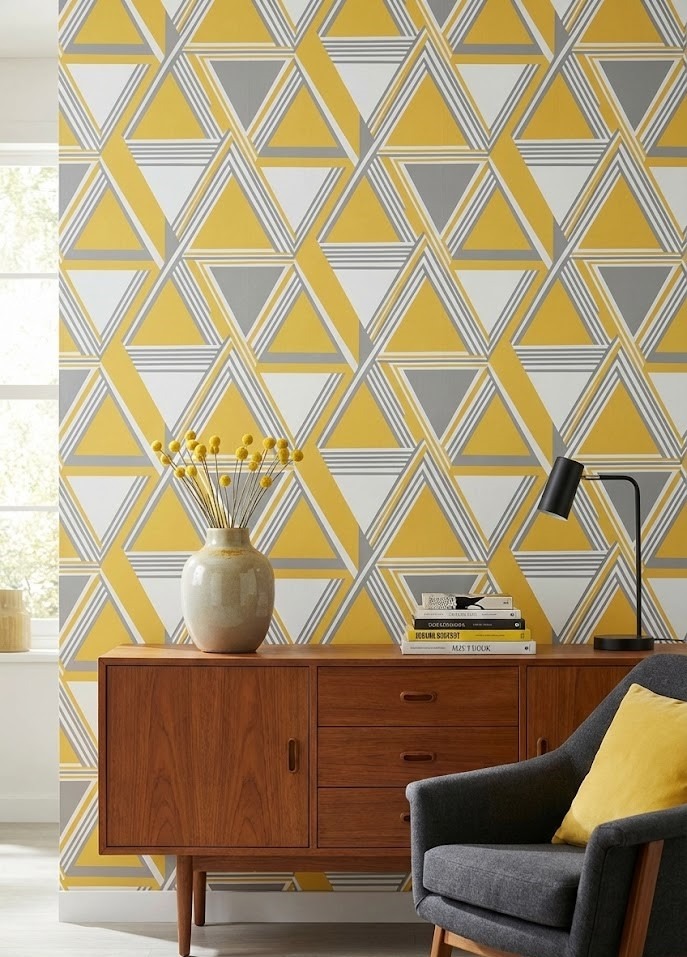 A geometric wallpaper featuring yellow patterns can add movement and energy to a space. It’s a great way to introduce pattern and color simultaneously.