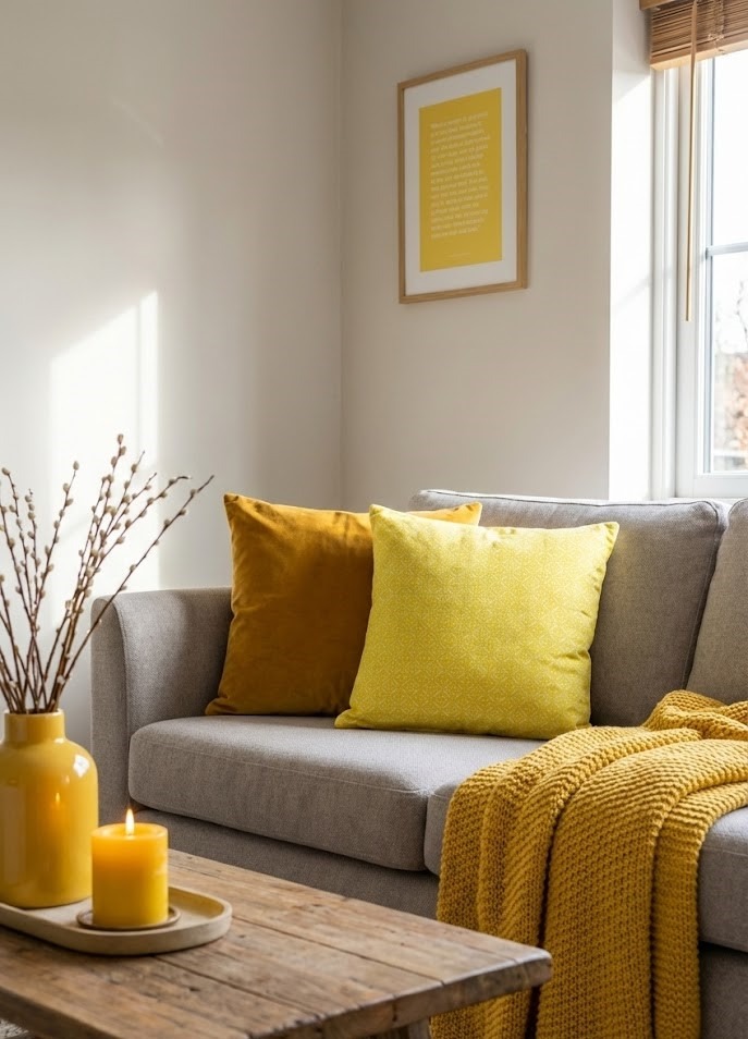 Pro Tip: Mix different tones, like a mustard pillow next to a lemon-colored candle, to create a curated, intentional look.