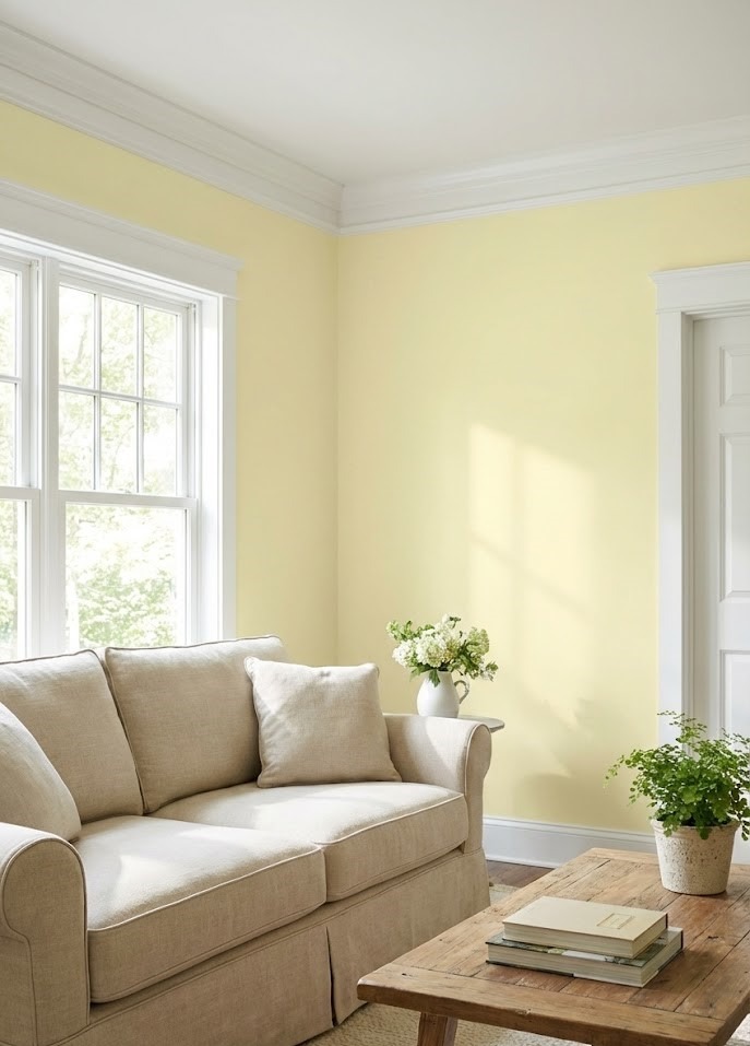 If you want to dip your toes into the yellow trend without overwhelming your senses, start with a buttery, pale yellow. This shade acts almost like a neutral but with an added layer of warmth. When paired with crisp white molding and trim, the room feels fresh, airy, and timeless.