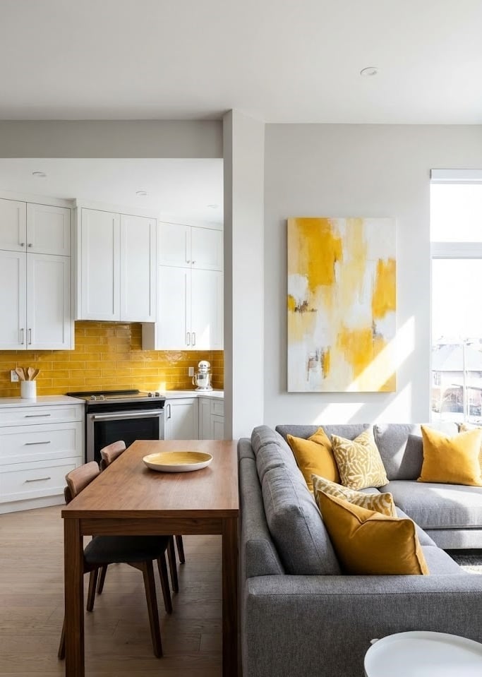 If your living room opens into the kitchen, use yellow to create flow. A yellow backsplash in the kitchen can be echoed by yellow artwork or pillows in the living area, making the entire floor plan feel cohesive.