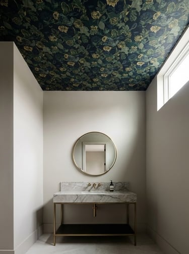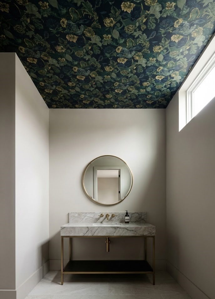 Who says wallpaper is only for vertical surfaces? Wallpapering the ceiling is a brilliant way to draw the eye upward without shrinking the room visually.