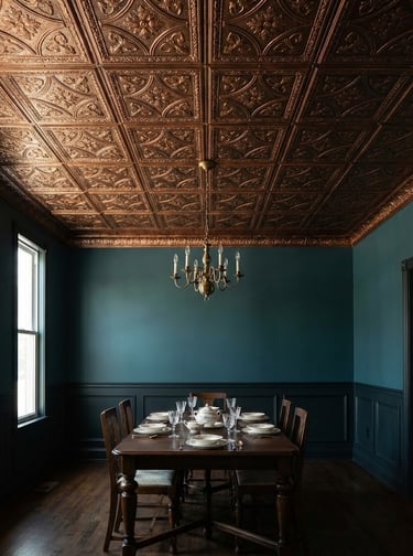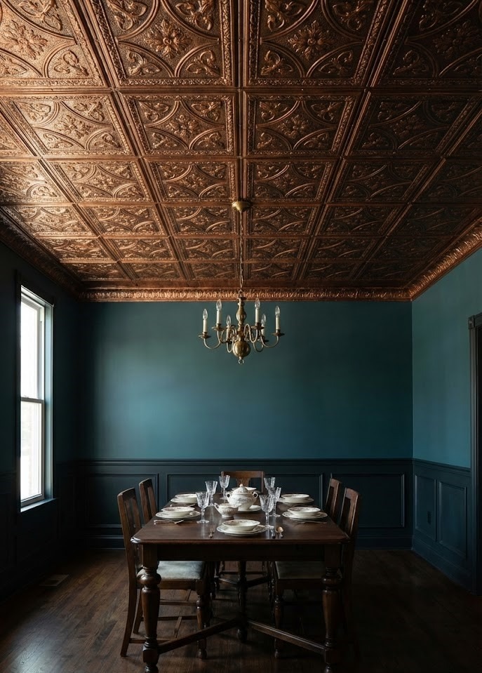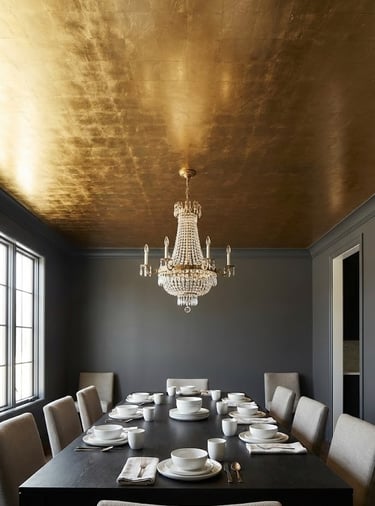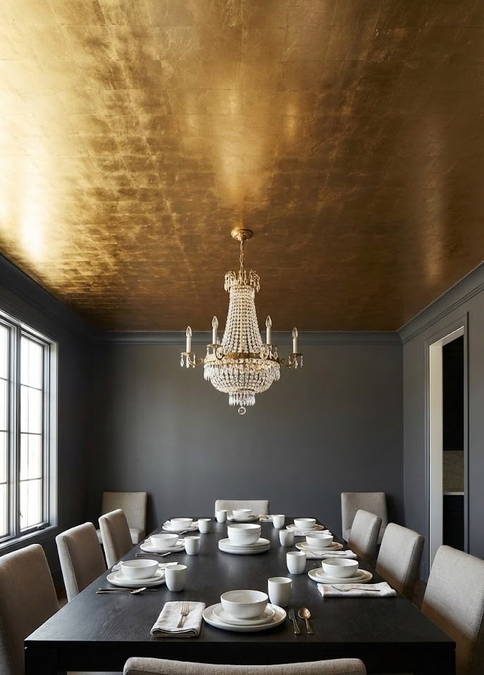 Why it works: A gold, silver, or bronze ceiling acts as a reflector. In a dining room by candlelight, a metallic ceiling casts a warm, shimmering glow over the table that is unmatched by flat paint. Style Tip: Keep the rest of the room's decor relatively matte to let the ceiling be the star.