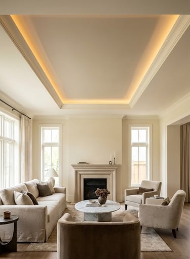 A tray ceiling features a recessed central section that is higher than the perimeter, creating an inverted "tray" look. This is a staple in master suites and formal dining rooms.