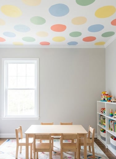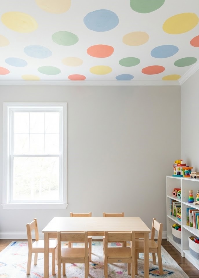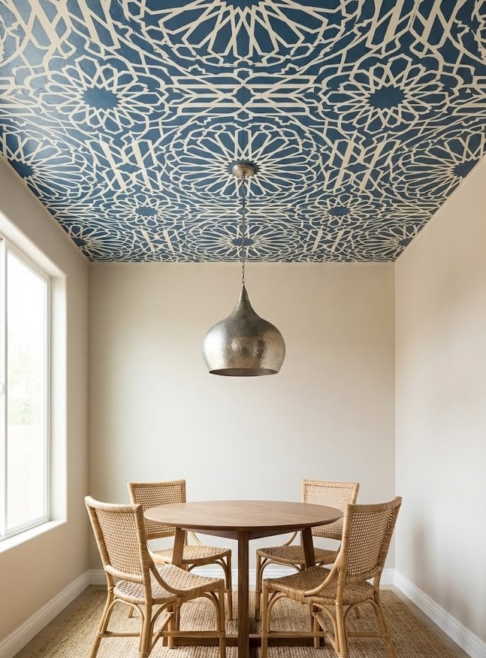 Different from a mural, this involves repetitive motifs like stripes, polka dots, or chevrons painted directly onto the ceiling.