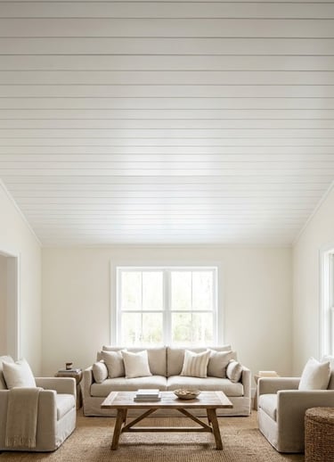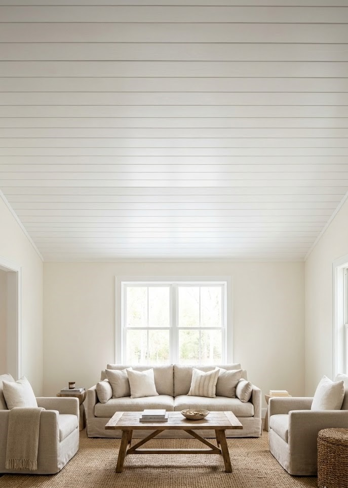 Why it works: The lines guide the eye, often making a room feel longer. Unlike heavy beams, shiplap offers a subtle texture that doesn't overwhelm low ceilings. Style Tip: Install the planks perpendicular to your windows to draw the natural light further into the room.