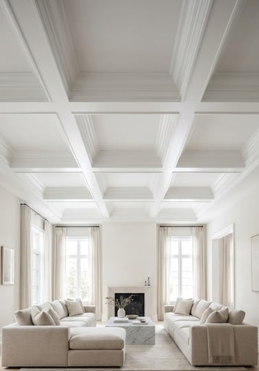 Coffered ceilings feature a grid of recessed panels framed by beams. Historically found in libraries and grand estates, this style brings immediate prestige and architectural weight to a home.