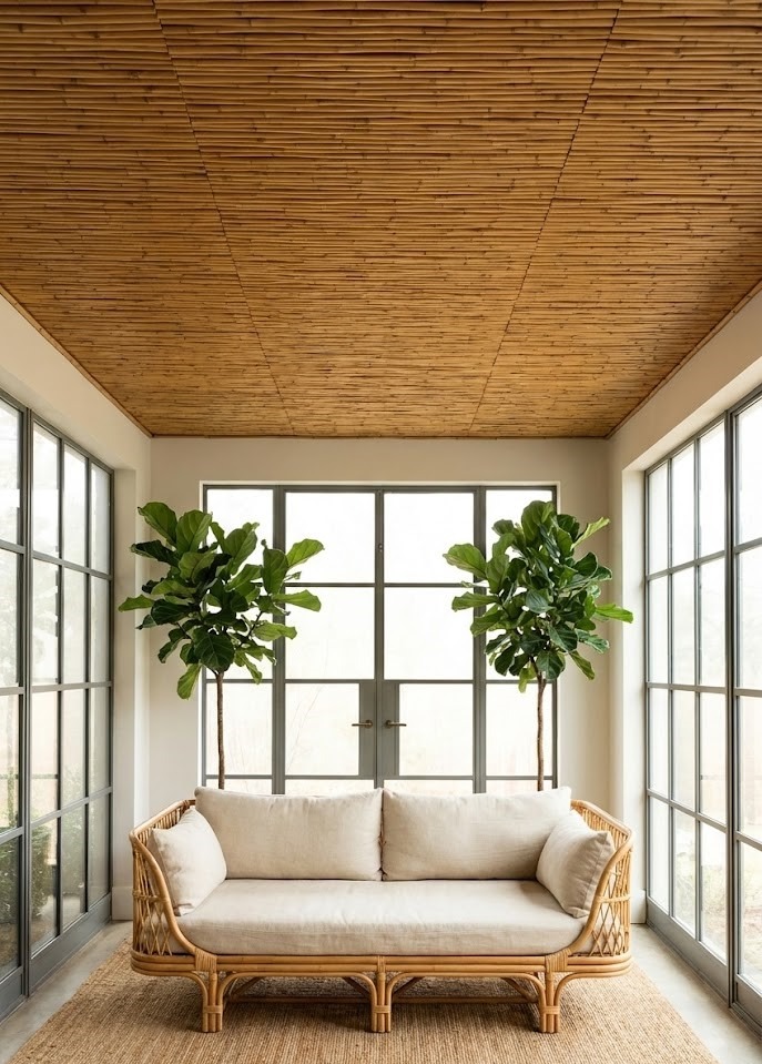 For a touch of Zen or tropical flair, bamboo reeds or woven mats can be installed flush against the ceiling.