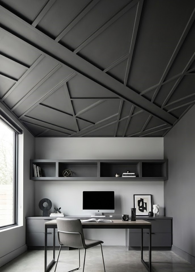 Move over, standard molding. Geometric paneling uses thin strips of wood (often MDF) to create abstract shapes, honeycombs, or asymmetry across the ceiling.