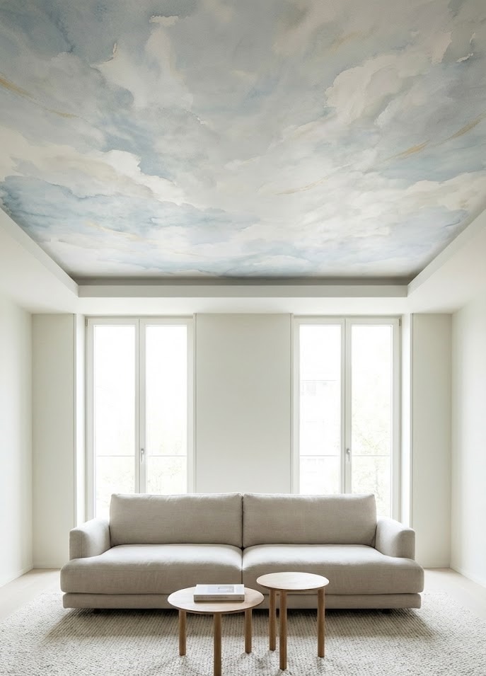 The ultimate statement is a hand-painted mural. Whether it is a cloudy sky, a floral canopy, or an abstract wash of watercolors, a mural turns your ceiling into a literal work of art.