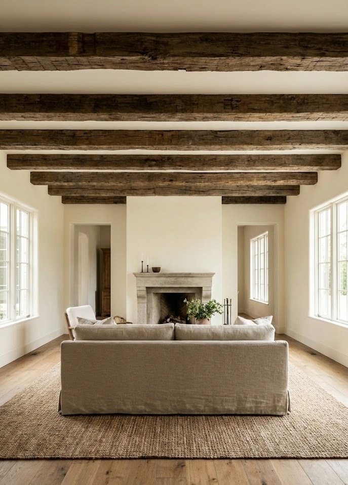 There is a reason exposed beams remain one of the most coveted features in interior design. Whether they are authentic structural timber reclaimed from an old barn or lightweight faux-wood installations, beams instantly ground a room.