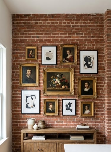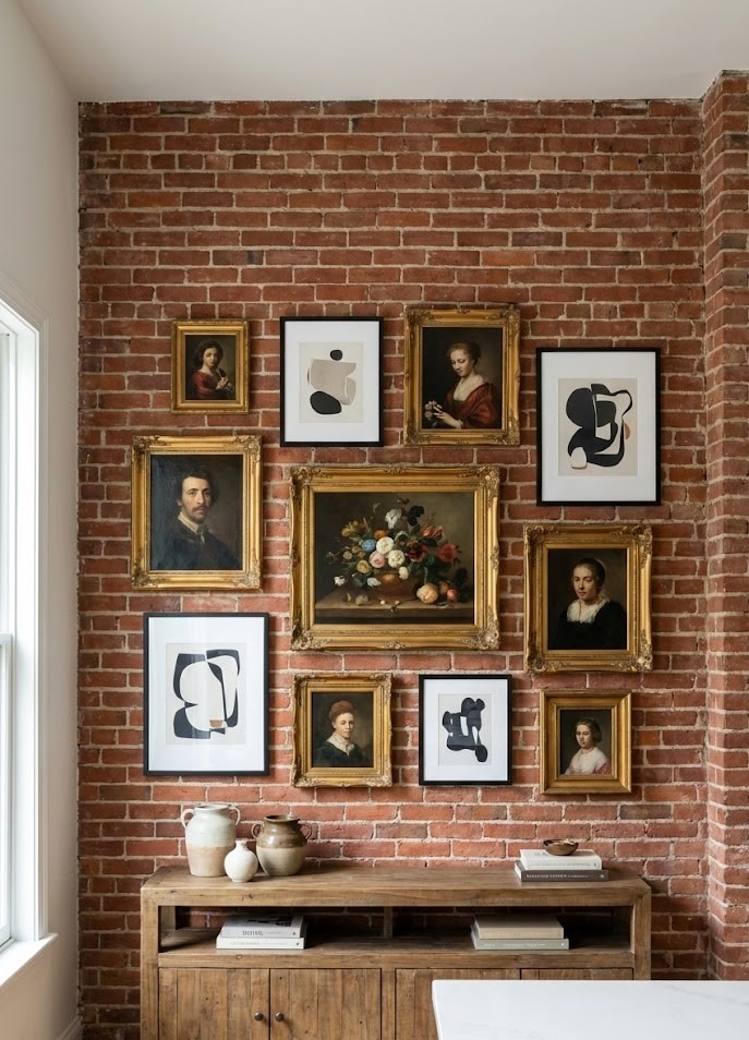 Treat the brick wall like a gallery. Hang vintage oil paintings, botanical prints, or modern abstract art in ornate frames. The brick provides a busy, textured background, so bold, simple art or heavy frames stand out best. It creates a collected, bohemian, "un-kitcheny" look that feels very personalized.