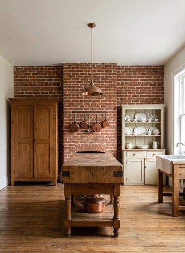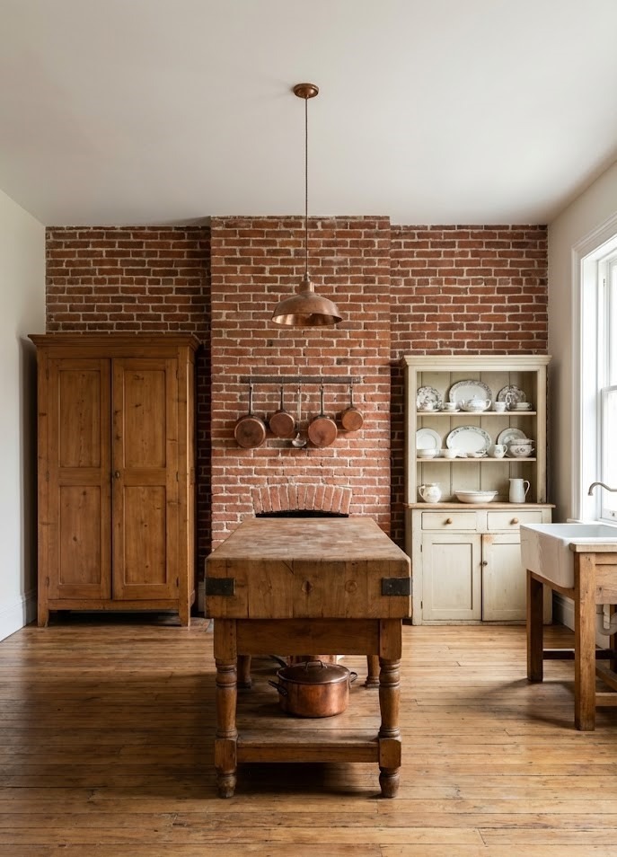 Move away from continuous built-in cabinetry and use freestanding furniture—a butcher block table, a standalone hutch, or a pantry armoire. This mimics the kitchens of the early 1900s. Brick walls feel most authentic when they aren't covered by wall-to-wall modern cabinetry boxes.