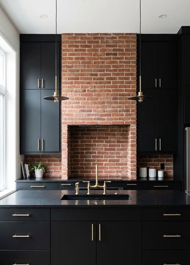 Style Tip: Use brushed brass or gold hardware on the black cabinets. The gold tones will pick up the warm flecks in the brick, tying the two contrasting elements together.