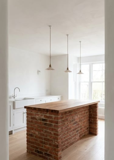 Flip the script: keep your walls smooth and plaster-white, but clad the base of your kitchen island in brick. It anchors the room. The island becomes a heavy, substantial architectural feature that feels like it grew out of the floor, rather than a piece of furniture just placed there.