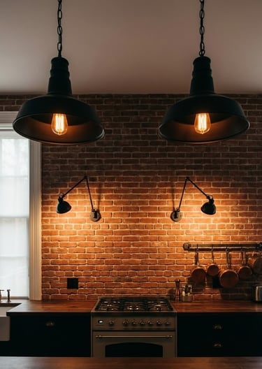 Lighting is key with brick because brick absorbs light rather than reflecting it. Use oversized factory-style pendants, cage lights, or barn sconces. It reinforces the industrial narrative. The warm glow of the bulbs highlights the texture and varying depth of the brick surface.
