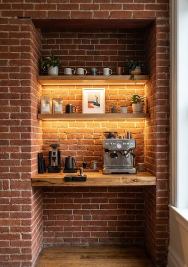 Utilize a small recessed area or corner with exposed brick to create a dedicated coffee station. It creates a "destination" within the kitchen. The brick makes the small nook feel intimate, like a local coffee shop, separating the morning ritual from the chaos of the main cooking area.