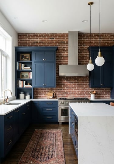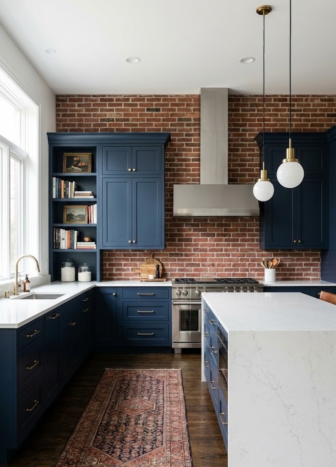 Deep Navy Blue cabinets paired with red brick create a rich, moody, and academic atmosphere. Blue cools down the orange tones of the brick, making the kitchen feel sophisticated rather than rustic. It’s a timeless color combination often found in historic brownstones and high-end renovations.
