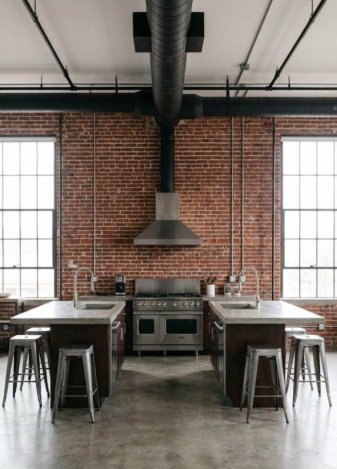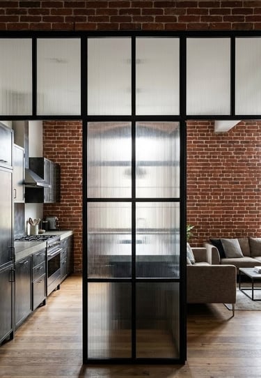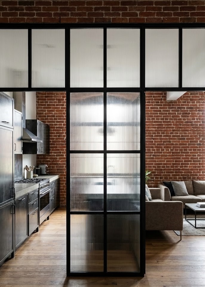 Separate your kitchen from the living area without losing light by using steel-framed glass partitions set against the brick. It maintains the open-concept feel while creating sound separation. The black steel grid mimics the industrial vibe of the brick while adding a layer of transparency.