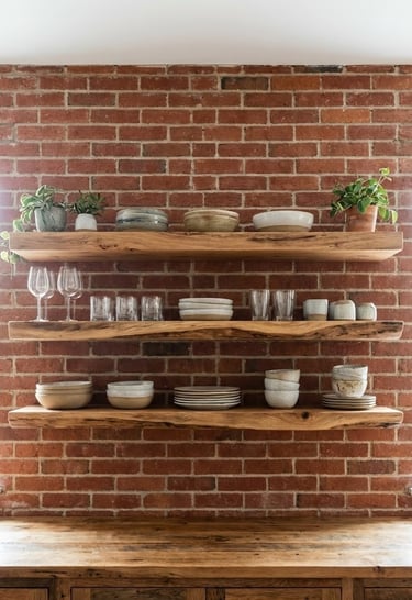 Real-World Application: Use live-edge walnut shelves to introduce an organic curve against the rigid rectangular lines of the brick.