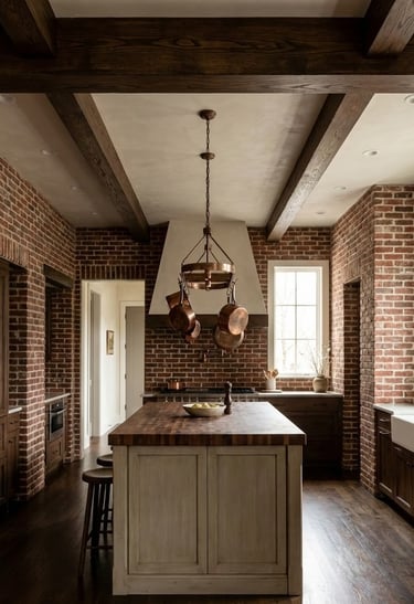 Style Tip: Stain the beams a dark walnut to match the darkest bricks in your wall mix, creating a cohesive color story.