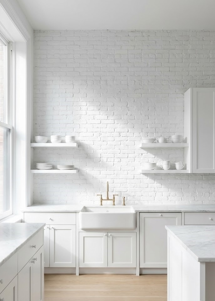 If you love the texture of brick but hate the color red, simply paint it bright white. You keep the shadow lines and the uneven texture, which adds character, but you gain the light-reflecting benefits of a white kitchen. This is ideal for Scandinavian or Coastal design styles.