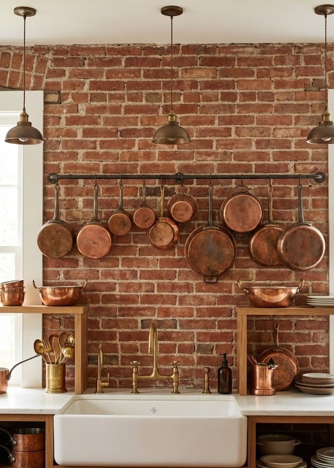 Style Tip: Hang a rail of copper pots directly onto the brick wall for a French country kitchen vibe that doubles as storage.