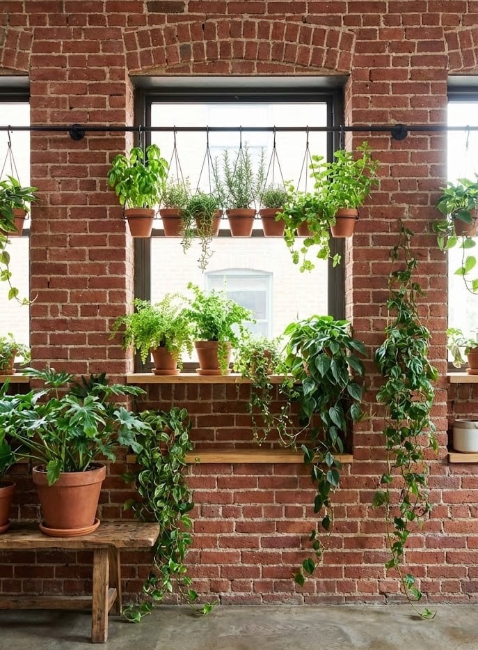 Red and Green are complementary colors on the color wheel. Placing lush greenery against a red brick wall makes both colors pop vividly. It breathes life into the masonry. The organic, trailing shapes of Pothos, Ferns, or Ivy break up the rigid grid pattern of the mortar lines, creating a space that feels alive.