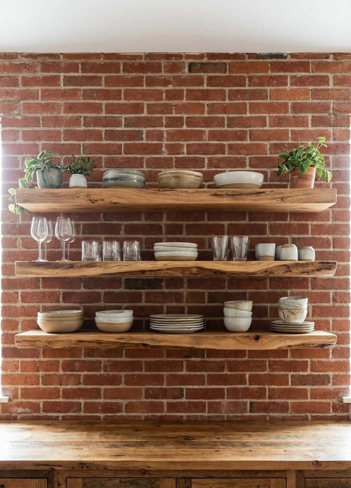 Brick walls are beautiful, but they present a challenge: they are difficult to drill into and can look cluttered if covered by bulky upper cabinets. Mounting sturdy floating shelves made of reclaimed wood or metal creates a functional display. Open shelving keeps the brick visible while providing storage for your prettiest dishware, turning your kitchen storage into decor.