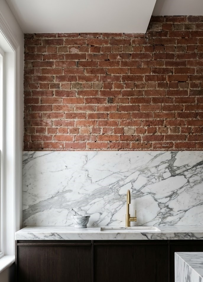 Mix high and low. Pair rough, "cheap" brick with expensive, high-vein marble or quartz countertops and backsplashes. The juxtaposition is luxurious. The smooth, cool touch of marble elevates the brick from "construction site" to "high-end design."