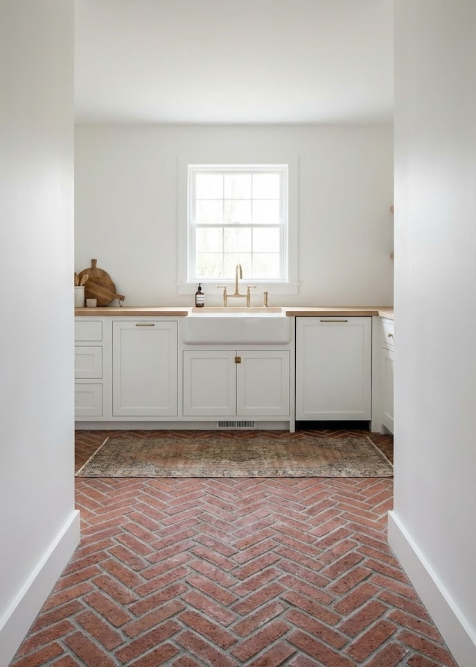 If your walls are drywall, bring the brick to the floor. A herringbone pattern brick floor is incredibly durable and hides dirt well. It feels like an old European courtyard or a rustic wine cellar. It’s ideal for mudrooms and kitchens that see high foot traffic and messy boots.