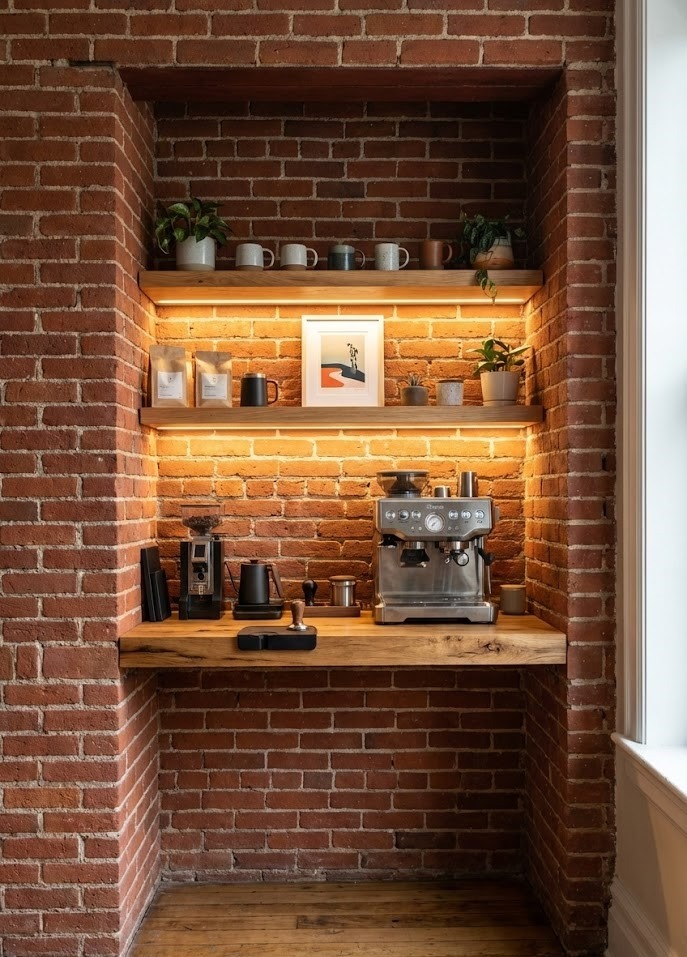 Style Tip: Add under-shelf LED strip lighting in the nook. In the early morning, the soft glow against the brick is welcoming and much better than turning on the harsh overhead lights.