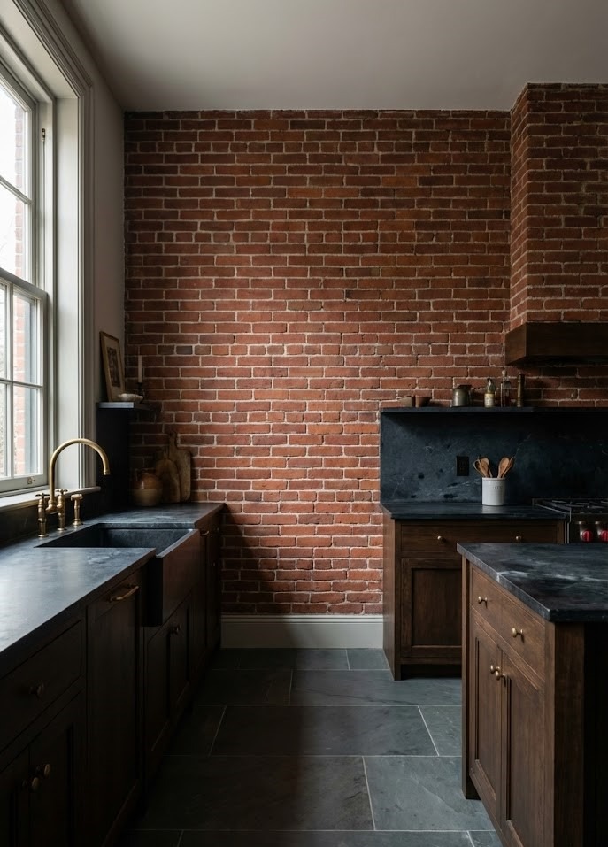 For a darker, deeper palette, pair red brick with soapstone countertops and slate grey floors. Soapstone has a matte, velvety texture that complements brick better than shiny granite. It creates a historic, "lived-in" feel that suggests the kitchen has been there for a century.