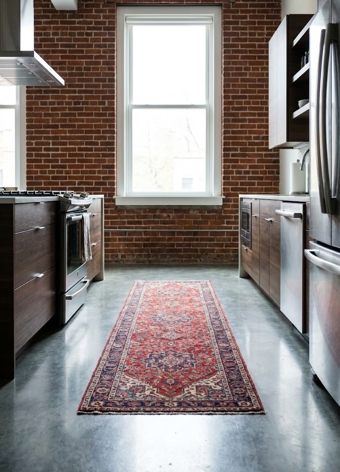 Style Tip: Add a vintage Persian runner rug in deep reds or blues to soften the acoustics, warm up the floor, and bridge the color gap between the grey floor and red wall.