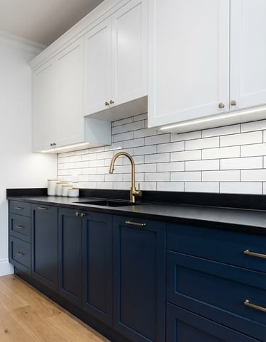 Black countertops are the perfect "bridge" for two-tone kitchens. For example, having navy blue lower cabinets and white uppers can be unified by a continuous black countertop. This creates a sophisticated, anchored look that feels intentional rather than indecisive.