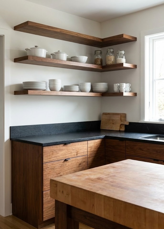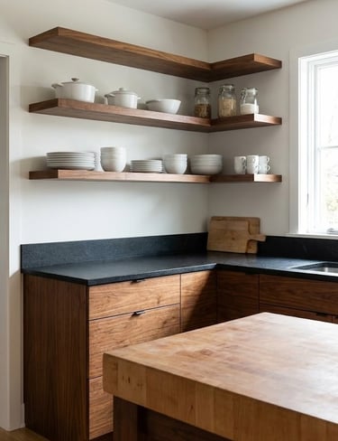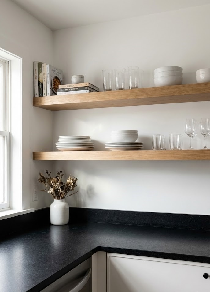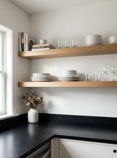 Pairing solid black countertops with light wood open shelving creates a beautiful interplay of light and shadow. The shelves provide an "airy" feel that balances the weight of the black stone, while the dark backdrop makes white dishes and glassware look curated and magazine-ready.