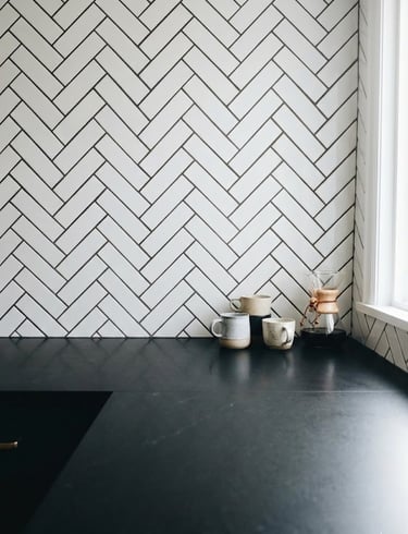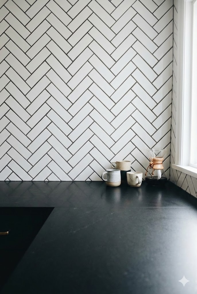 If you love herringbone or subway tile patterns, black countertops provide the necessary visual "anchor." By keeping the horizontal surface solid and dark, you can experiment with complex tile layouts on the walls without the room feeling cluttered or chaotic.