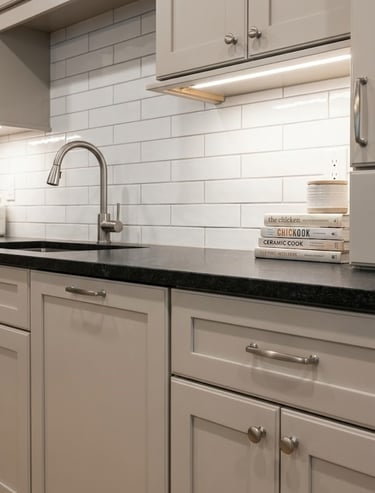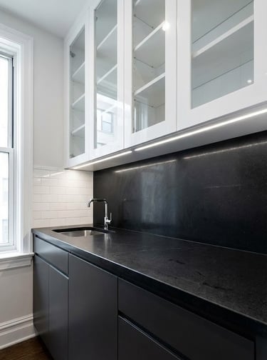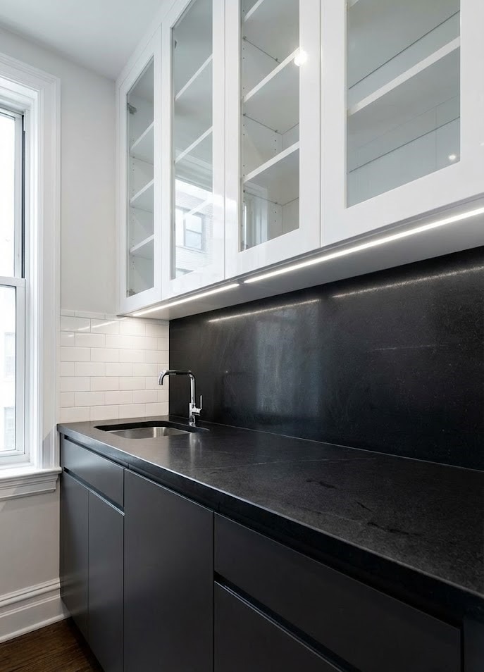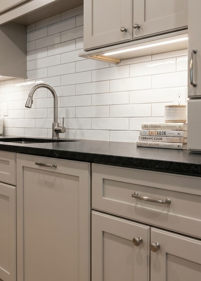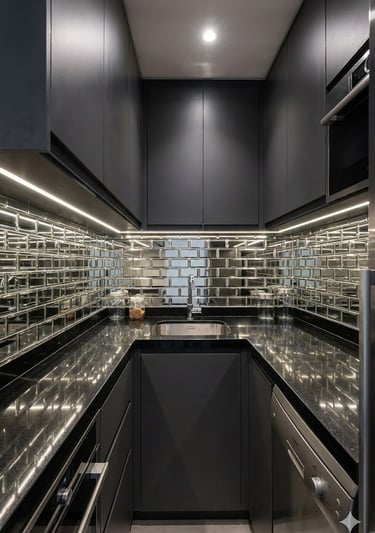 A common design myth is that black makes a room look smaller. In reality, black countertops can provide a strong horizontal line that gives structure and definition to compact layouts. When paired with under-cabinet LED lighting and light upper cabinetry, black surfaces make a small kitchen feel purposeful and high-end.